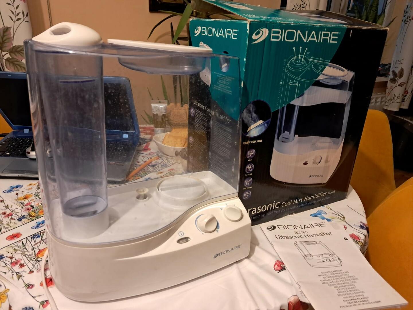 Sprzedam ultradźwiękowy nawilżacz powietrza BIONAIRE, model BU485 widoczny na zdjęciach, nieduży, kompaktowy, stan bardzo dobry, prawie nieużywany, oryginalnie opakowany, w komplecie instrukcja, karta gwarancyjna, dostarcza do 7.6 litra chłodnej wilgoci na dobę, dwie prędkości nawilżania z regulacją natężenia "mgiełki", nawilża skutecznie pomieszczenia do 50 m2, układ oczyszczania usuwa nieczystości, posiada wymienny wkład filtrujący, możliwość dodania olejków zapachowych do wody, bardzo cicha praca idealne do pokoi dziecięcych, salonów i biura.